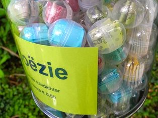 De gedichten zijn allemaal gedrukt op een bijpassend papier in een eigen kleur. Soms is het handgeschept en met glitters, soms is het half-doorzichtig met een tekening of voorzien van een bijzonder reliëf. Voor een halve euro, heb je een capsule met een origineel tuingedicht.