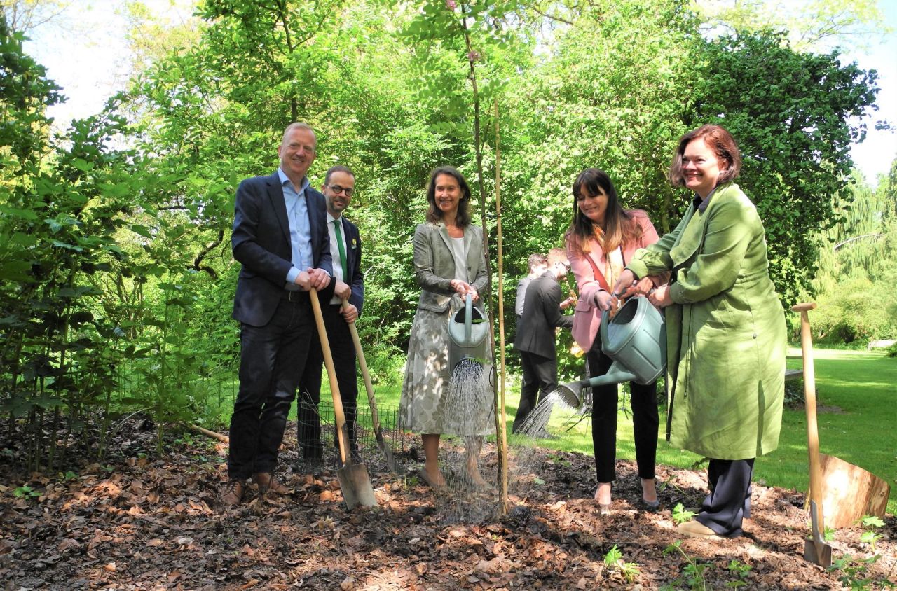 Gedeputeerde Mireille Colson van de provincie Antwerpen en conservator-directeur Abraham Rammeloo bedankten de Sloveense Ambassade voor de symbolische en waardevolle boomplanting in de arboretumtuin.
