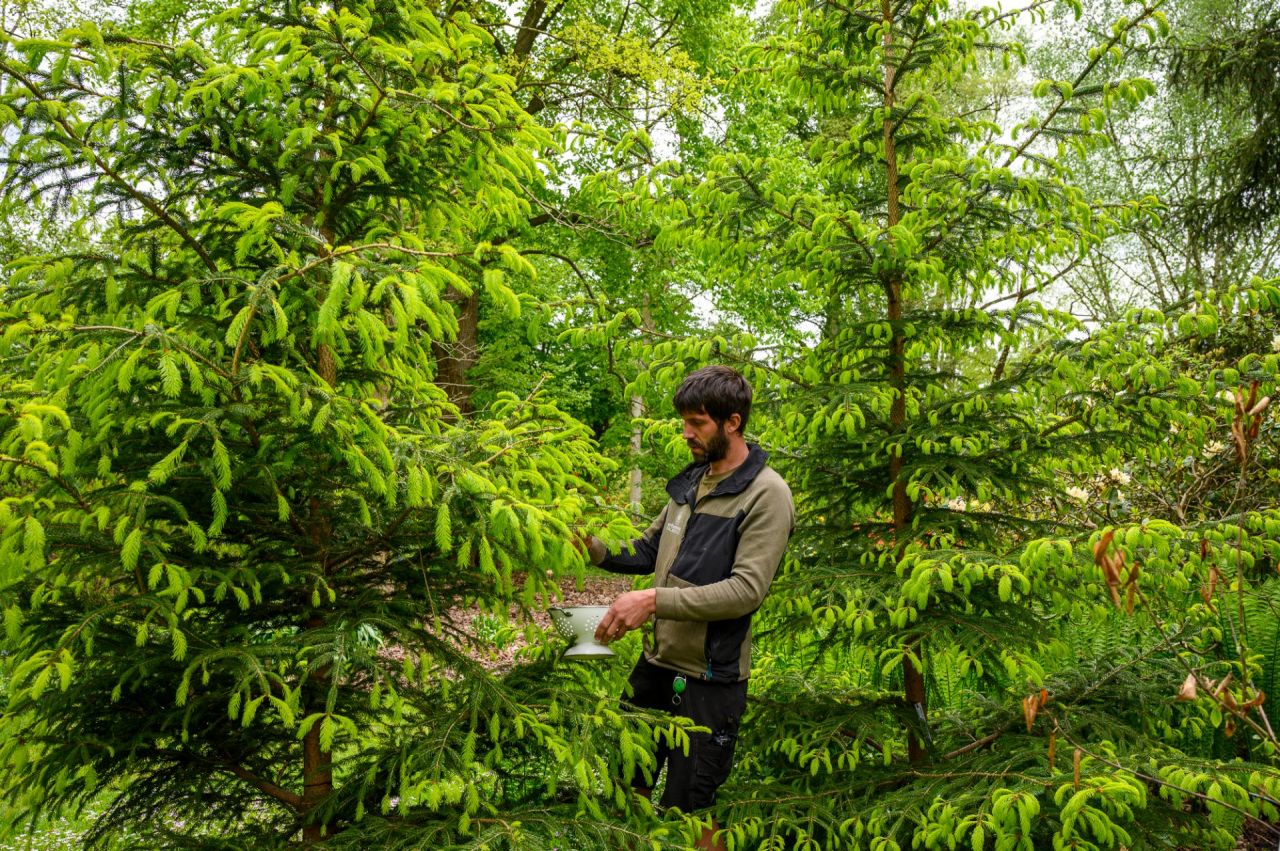 Voor de tweede Arboretum Gin wilde Arboretum Kalmthout absoluut een conifeer uitproberen. Assistent-tuinchef Steven Vanden Bergh ging dus aan het plukken. Van de spar Picea orientalis ‘Georges De Belder’ haalde hij voorzichtig de fluokleurige jonge topjes van de uiteinden van de takken. Enkele weken later koos hij de geurigste rozen aan de struiken van Rosa ‘Duchesse de Berry’ uit. Beide ingrediënten werden door Sterkstokers verder verwerkt tot volwaardige extracten om in één gin te verwerken.