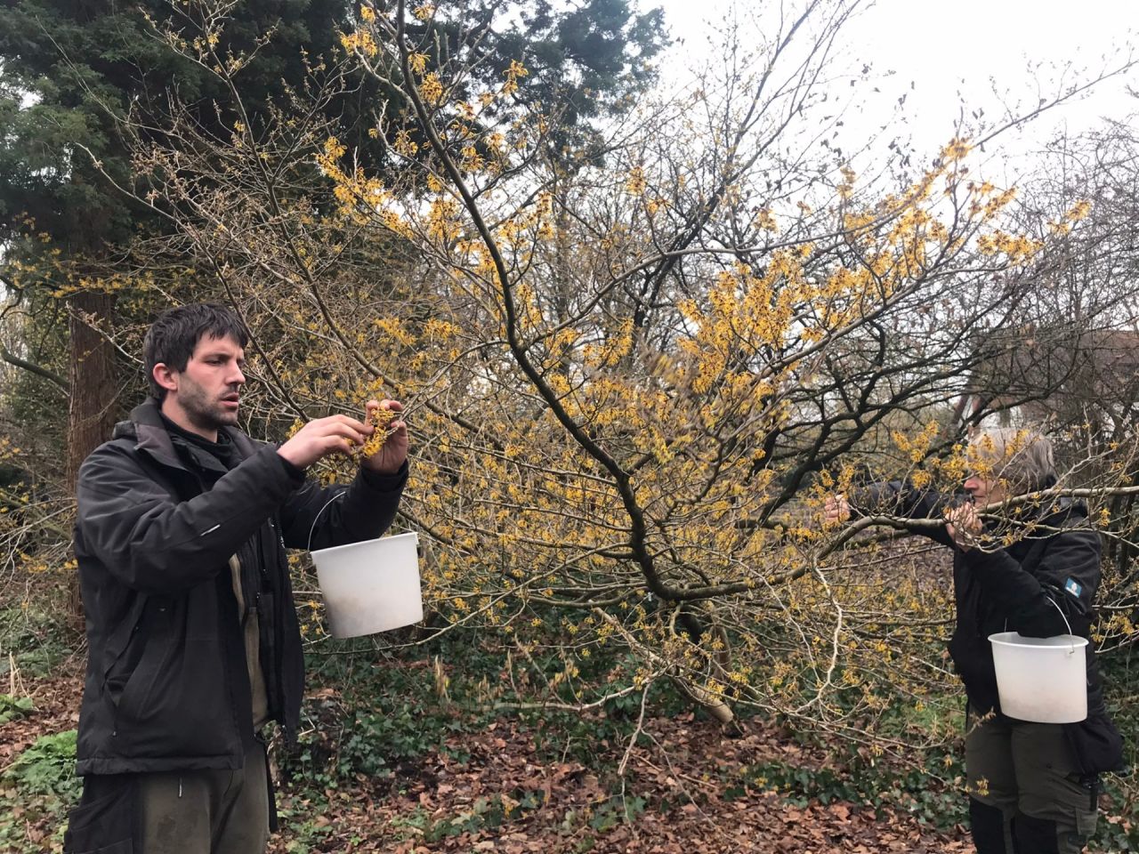 Het zijn de bloempjes van enkele gele toverhazelaars, Hamamelis, uit de tuin van Arboretum Kalmthout die de Arboretum Gin zo uniek parfumeren. Bloeiende toverhazelaars zijn van half december tot eind februari in de arboretumtuin te vinden. Assistent-tuinchef Steven Vanden Bergh en tuinier Annette Kritzen plukten tijdens het hoogtepunt van de bloei emmers vol bloempjes van verschillende sterk geurende, gele cultivars, die meteen naar het ambachtelijke atelier van Sterkstokers vertrokken. Daar werden de bloemen geprepareerd om te kunnen verwerken in een botanische gin.
