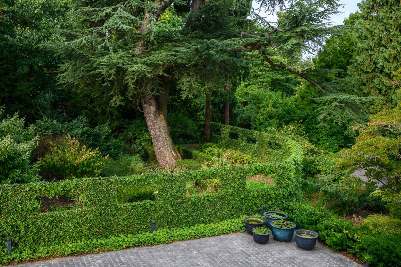 Na de succesvolle renovatie van het Vangeertenhof van Arboretum Kalmthout in 2020, kwam twee jaar later de doorkijkhaag naar historisch model weer in het straatbeeld van deze erfgoedsite. De doorkijkhaag sluit aan op het Vangeertenhof en is ondertussen toegegroeid met bijzondere klimop en wilde wingerd. De doorkijkhaag is een moderne interpretatie van een haag die van eind 19de tot midden 20ste eeuw in Kalmthout groeide. “Die haag, geplant in 1872, dateert uit de periode dat op deze plek nog geen arboretum was, maar wel een kwekerij van bijzondere bomen en planten, eigendom van Charles Van Geert,” legt conservator-directeur Abraham Rammeloo uit. “De haag vormde toen de helft van een zogenaamde berceau, een overdekt tuinpad dat de kwekerij aan de straat begrensde, en had vooral een logistieke functie. Het was een schaduwplek die diende als beschutte stockageplaats voor planten die klaar waren voor transport naar klanten. Om toch licht te hebben, zowel voor de planten als voor het personeel, waren er ramen in de haag gesnoeid. De berceau had toen aan elke zijde een rode beukenhaag en als ‘dak’ een begroeiing van klimop en wilde wingerd."