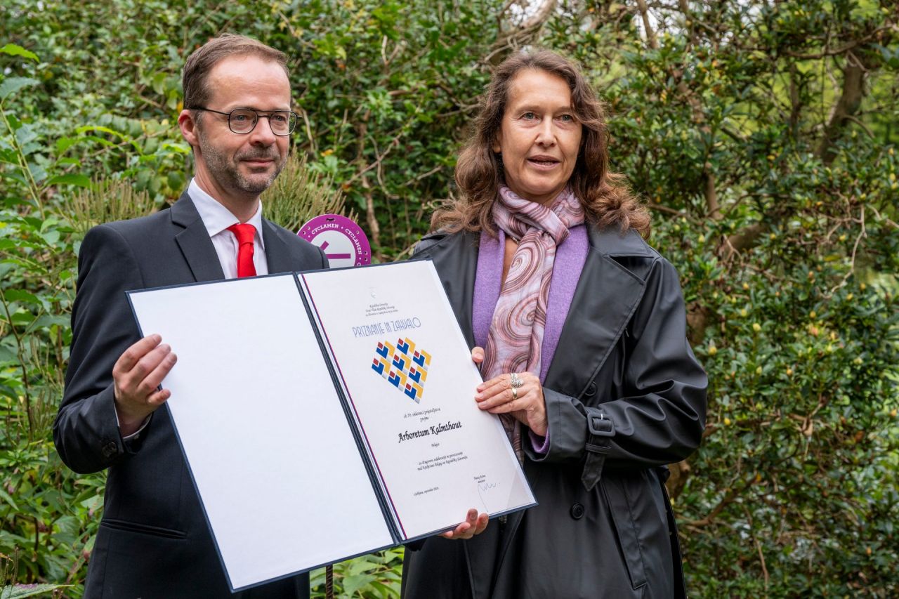 Hierop verraste Ambassadeur Sušnik directeur Abraham Rammeloo met een uitzonderlijke oorkonde van de Republiek Slovenië als erkenning van de waardevolle samenwerking tussen Arboretum Kalmthout en Slovenië: “Nog mooier is dat de band gebaseerd is op een liefdesverhaal tussen Jelena en Robert De Belder, maar het werd ook een liefdesverhaal tussen een arboretum en een land. Vandaag wil ik directeur Abraham Rammeloo bedanken voor het blijvend voeden en ondersteunen van deze liefde.”