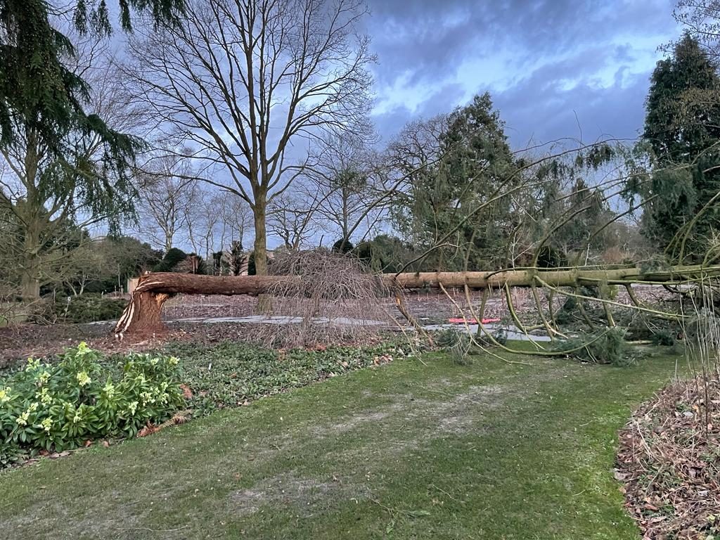 Maandag 21 februari in de late namiddag verloor een meerstammige conifeer in de coniferendreef, vlakbij het Vangeertenhof, een stam, waardoor hij een grote tak van een van onze oude Magnolia's mee nam in zijn val.
