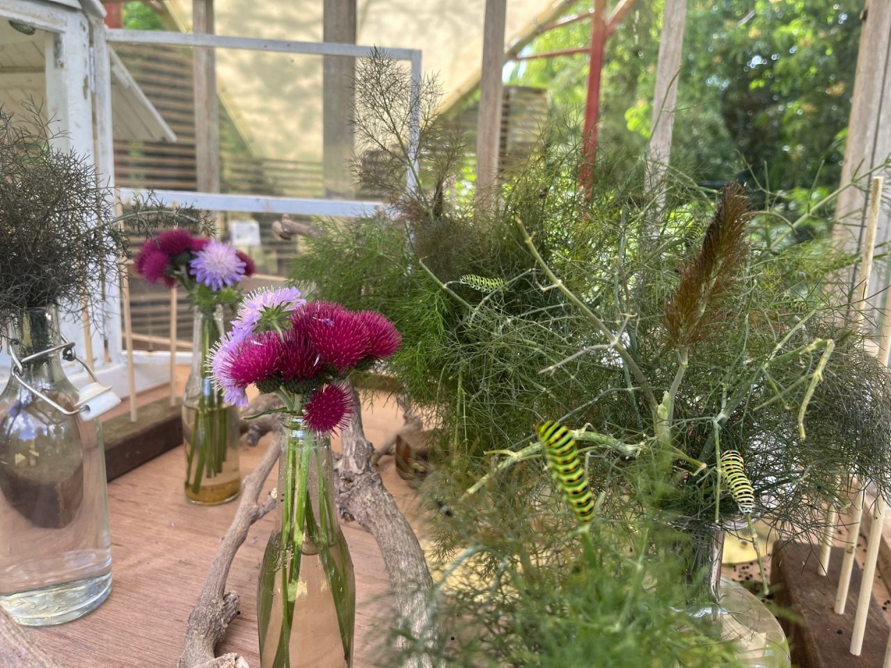 De vlinders hebben zich ondertussen al goed voortgeplant, we vonden al erg veel rupsen in het arboretum. Omdat de vrijlating gebeurde in het paviljoen in de vlindertuin is de eerste stop van jonge vlinders immers de vlindertuin van Arboretum Kalmthout, waar nectarrijke lentebloeiers zoals paardenbloemen nu open staan, ideaal voedsel voor de vlinders! Wat verderop in de rode tuin en ook in de Oudolf borders vinden de koninginnenpages dan weer waardplanten zoals venkel. Daar leggen de vlinders na de paring hun eitjes. Deze plant is namelijk het favoriete hapje van de vlinderrupsen, dat zij meteen voorgeschoteld krijgen wanneer ze uit hun eitje kruipen. Op die plekken vonden onze tuiniers de afgelopen dagen veel rupsen. Ze brachten die naar de kast en zetten er venkel bij, zodat ze hun verdere levenscyclus er kunnen doorbrengen, veilig voor vogels, maar wel voor het oog van de bezoekers van Arboretum Kalmthout.